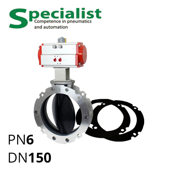- SCBF-BV2-6JA-150 — сам дисковий поворотний затвор фланцевий з DN150 PN6. Легкий корпус з алюмінієвого сплаву, диск чавун, сідло NBR.