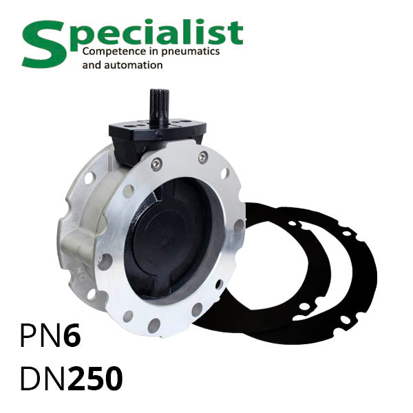 Фланцевий затвор батерфляй з поворотним диском серії SCBF-BV2-6JA-250 застосовується для повітряно-гравітаційного транспортування текучих сипучих матеріалів (гранул, бетону, піску, тощо) при низькому тискові PN0.1. Серія розрахована для труб до силосів та бункерів з діаметром умовного проходу d 250 мм. Встановлюється дана трубопровідна арматура за допомогою фланцевих кріплень з використанням додаткового гумового ущільнення між трубою та засувкою, що входить у вартість базової комплектації SCBF-BV2-6JA-250 Specialist.