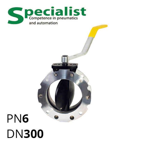 Фланцевий батерфляй з ручним управлінням серії SCBF-BV2-6JA-300-H це дискова поворотна заслінка ДУ 300 для текучих та сипучих продуктів (гранул, зерна, муки) при тискові PN0.1 у збірці з надійним ручним приводом. Вал та рукоятка засувки батерфляй з'єднані за допомогою надійного шліцьового типу з'єднання. Цим забезпечується міцність та захист від відкручування ручки. Комплект: