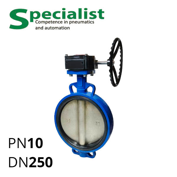 Цей ручний дисковий затвор чавунний встановлюється на трубу прохідним діаметром 250 міліметрів між попередньо привареними комірцевими фланцями ISO 7005-1(EN 1092-2). На корпусі розташовані приливи з отворами ("вушка") для центрування поворотної засувки між фланцями.