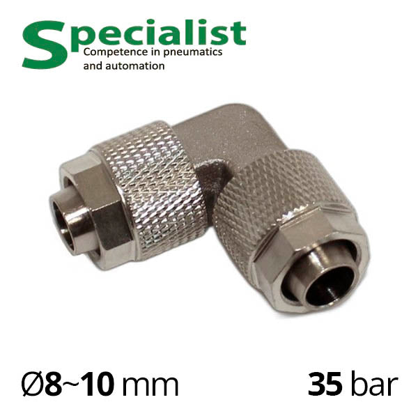 Металлический фитинг с накидными гайками SF-NPV – это угловой равнопроходный соединитель, позволяющий соединить два отрезка трубок с диаметром 10/8 мм . Например, гибкие трубопроводы из полиэтилена, полиуретана, полиамида или нейлона.